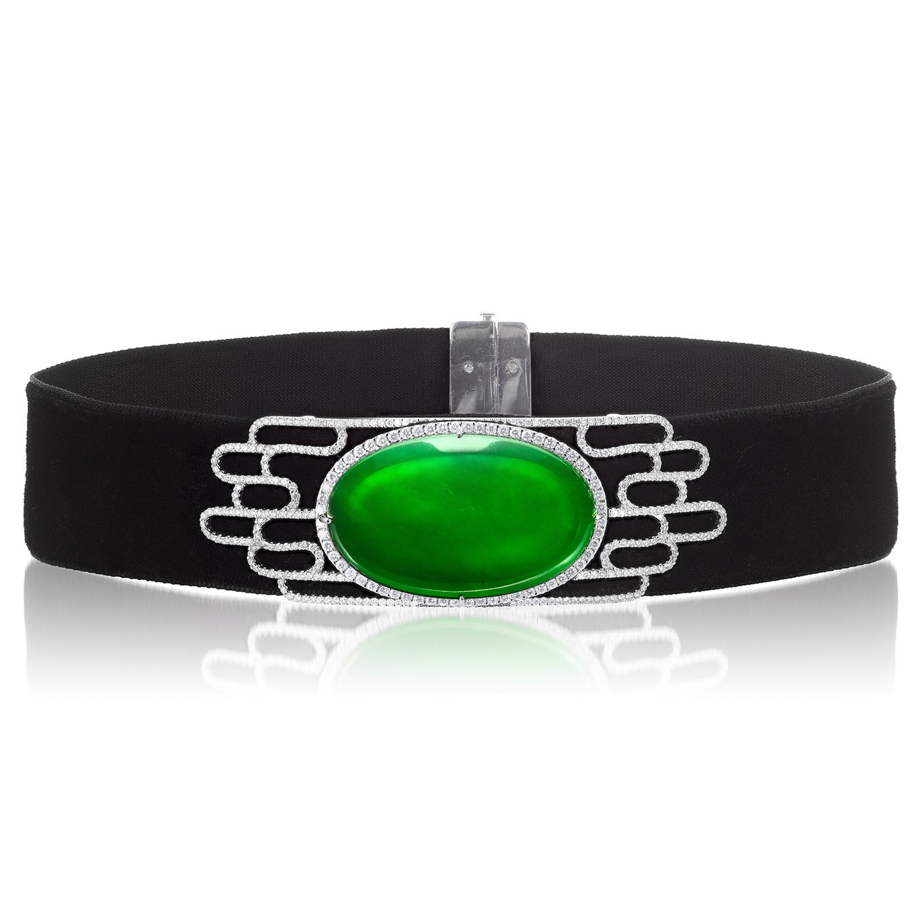 Set with an oval jadeite plaque of bright green colour and very good translucency, measuring approximately 35.85 x 22.12 x 5.76 mm, to the brilliant-cut diamond surround and openwork curved panel, joined by black velvet strap decorated with brilliant-cut diamonds, choker maximum length approximately 425 mm, accompanied by one white gold brooch fitting and two diamond-set pendant fittings.