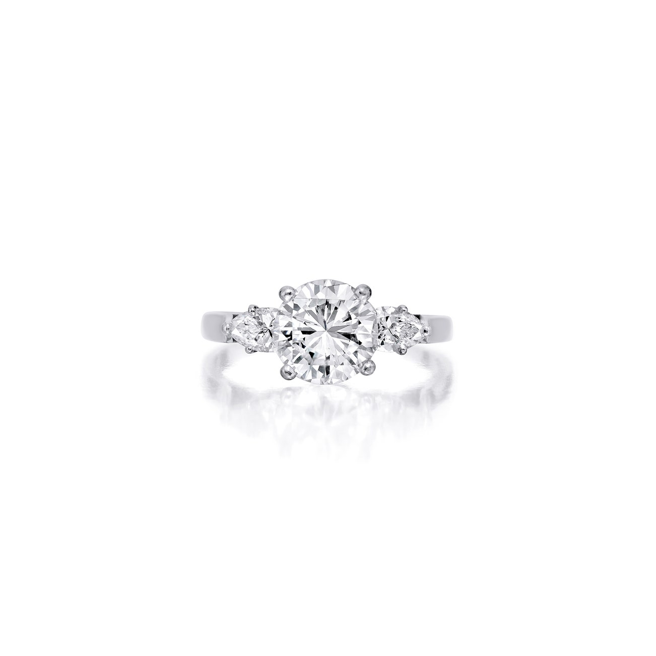 Set with a round brilliant-cut diamond weighing 2.18 carats, flanked by two pear-shaped diamonds, mounted in platinum, size 9.