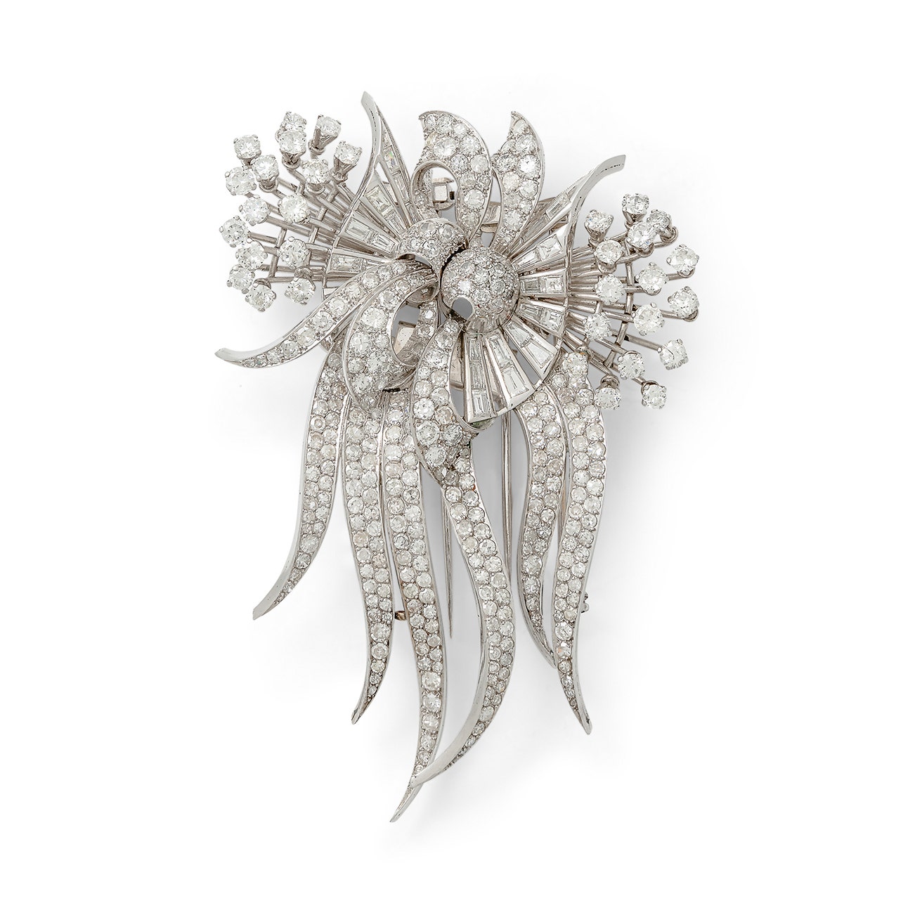 Of bow design, set throughout with circular-, single- and brilliant-cut diamonds, accented with baguette diamonds, measuring approximately 95 x 65mm, may be worn as two brooches.