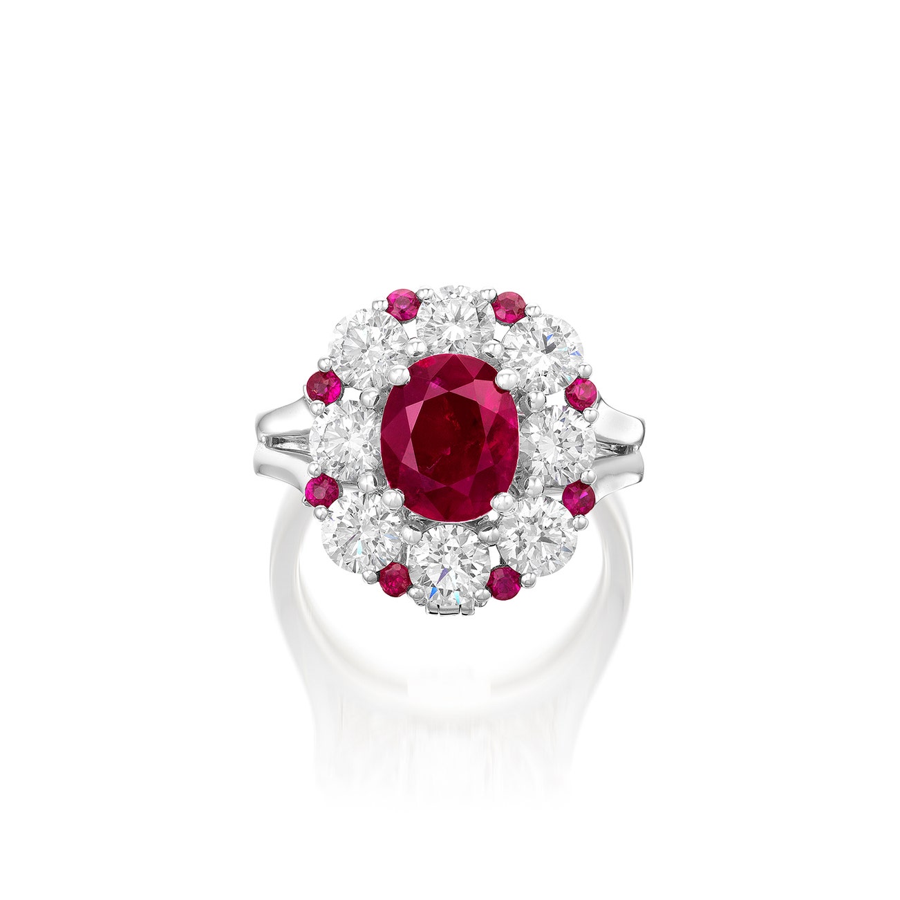 Set with an oval ruby weighing 3.04 carats, surrounded by brilliant-cut diamonds and circular-cut rubies, mounted in white gold, size 8, convertible to pendant.