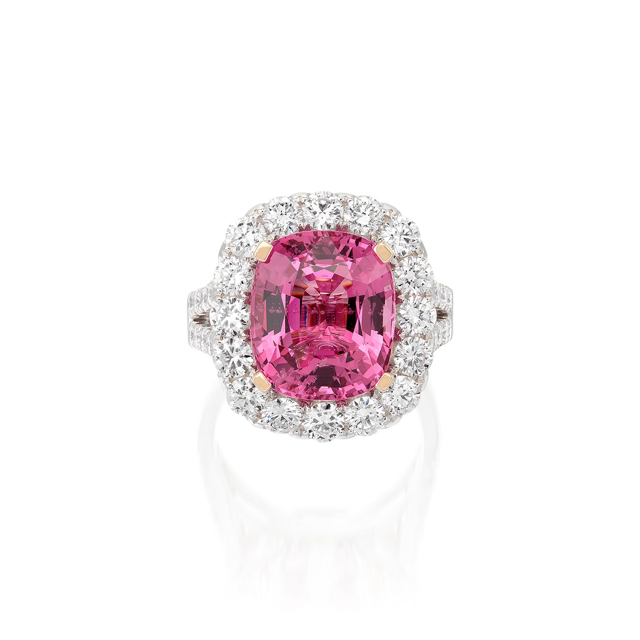 Set with a cushion-shaped pink spinel weighing 8.23 carats, to the brilliant-cut diamond surround and shoulders, mounted in white and pink gold, size 6¾, convertible to pendant.