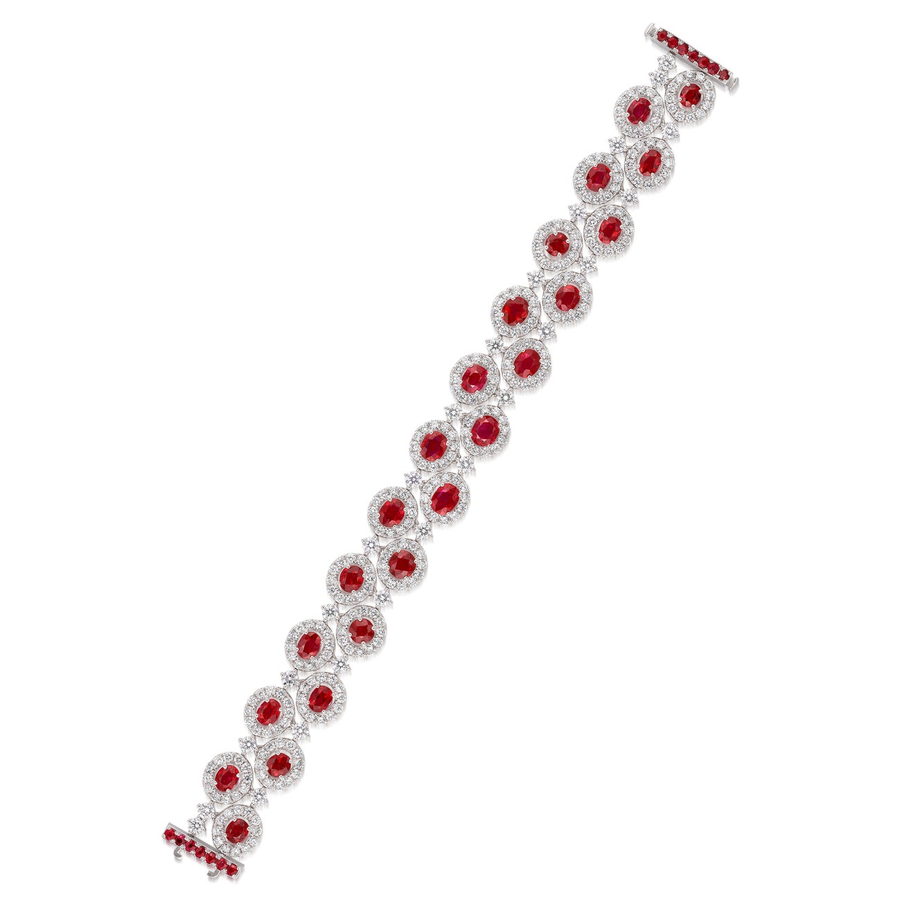 Set with twenty-three oval rubies, decorated with brilliant-cut diamonds, highlighted by circular-cut rubies, mounted in white gold, length approximately 165 mm.