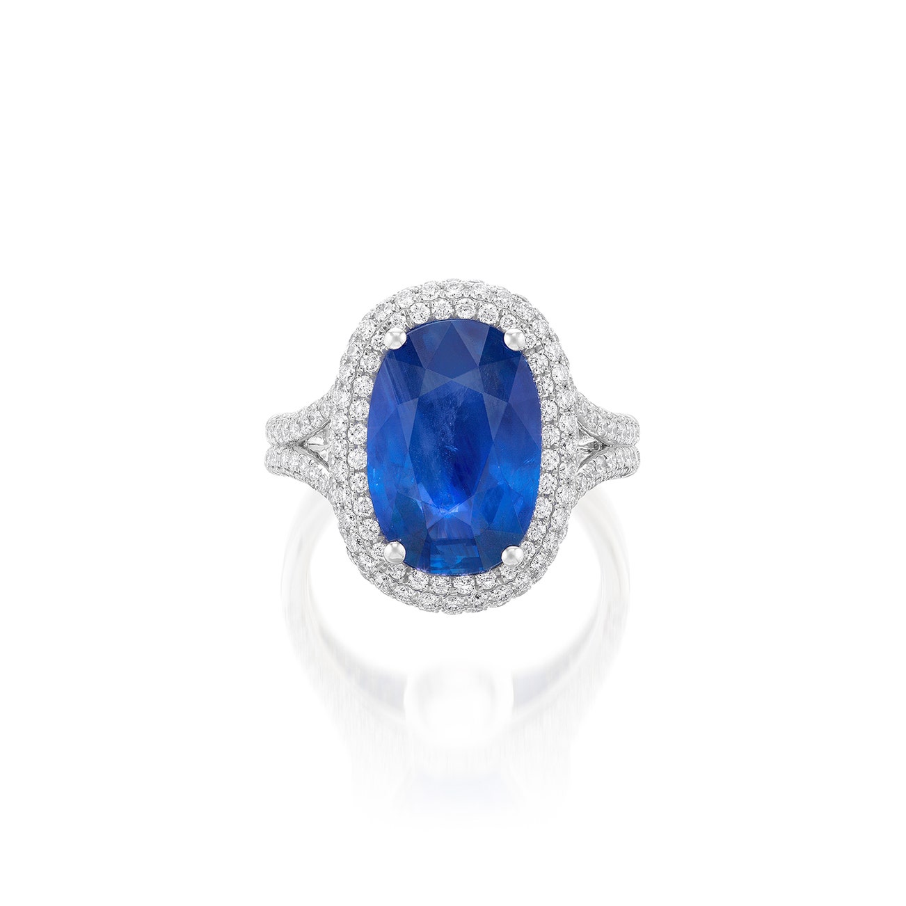 Set with an oval sapphire weighing 7.57 carats, to the brilliant-cut diamond surround, gallery and shoulders, mounted in white gold, size 7.