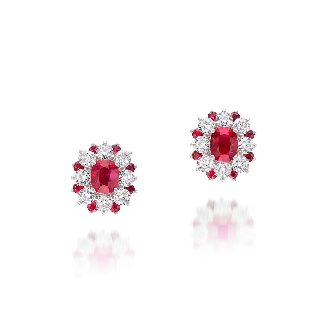 Each set with an oval ruby weighing 1.05 and 1.04 carats respectively, surrounded by brilliant-cut diamonds and circular-cut rubies, mounted in white gold, post and butterfly fittings, length approximately 12 mm.