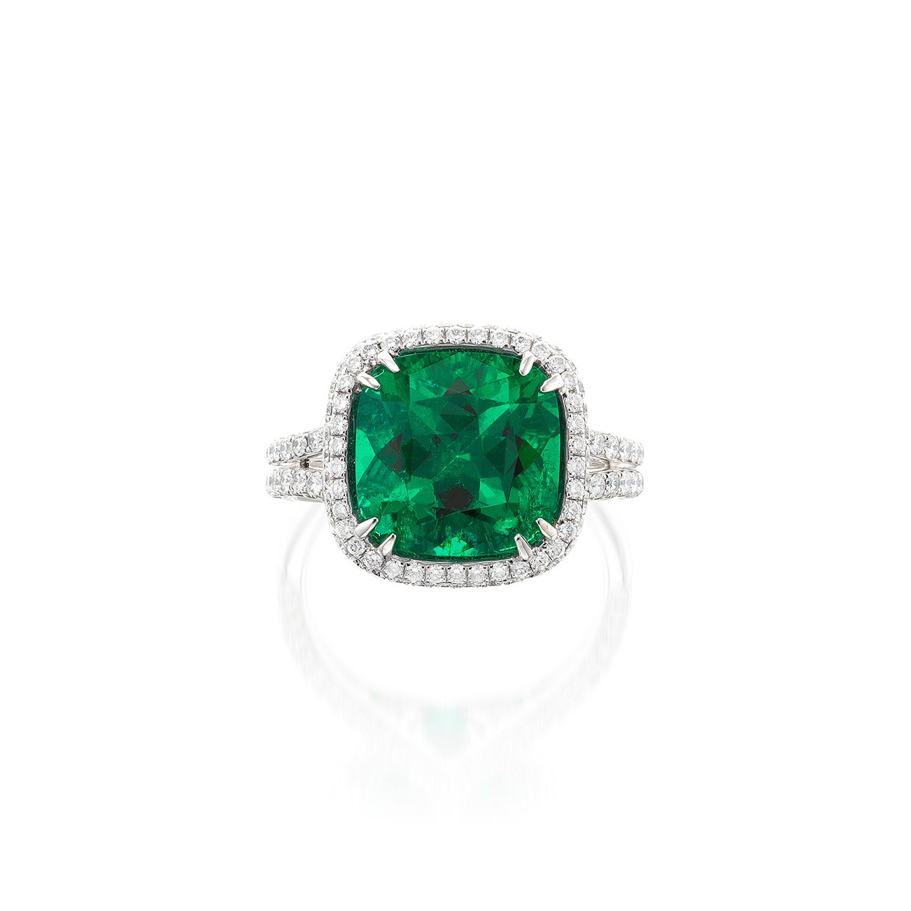 Set with a cushion-shaped emerald weighing 4.65 carats, to the brilliant-cut diamond surround, gallery and shoulders, mounted in white gold, size 6½.