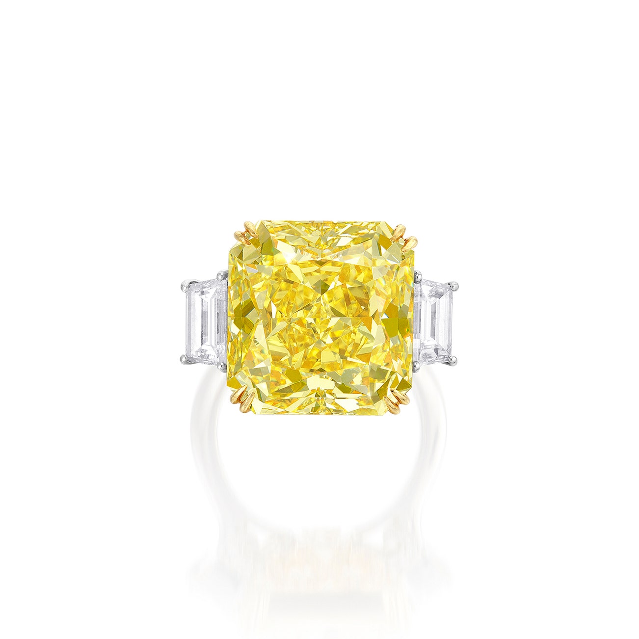 Set with a cut-cornered square modified brilliant-cut fancy vivid yellow diamond weighing 16.08 carats, flanked by two trapezoid diamonds, to the scrolled gallery set with brilliant-cut diamonds and diamonds of yellow tint, mounted in white and yellow gold, size 4¾.