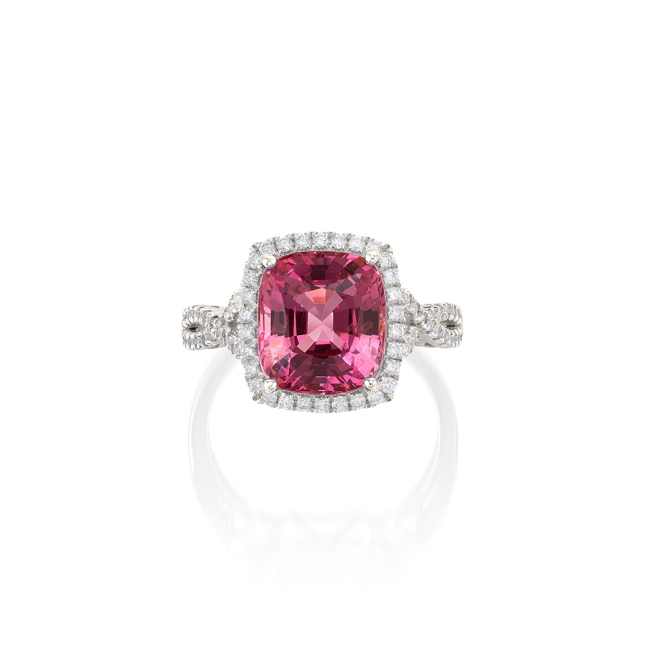 Set with a cushion-shaped spinel weighing approximately 5.62 carats, to the brilliant-cut diamond surround and shoulders, mounted in white gold, size 7.