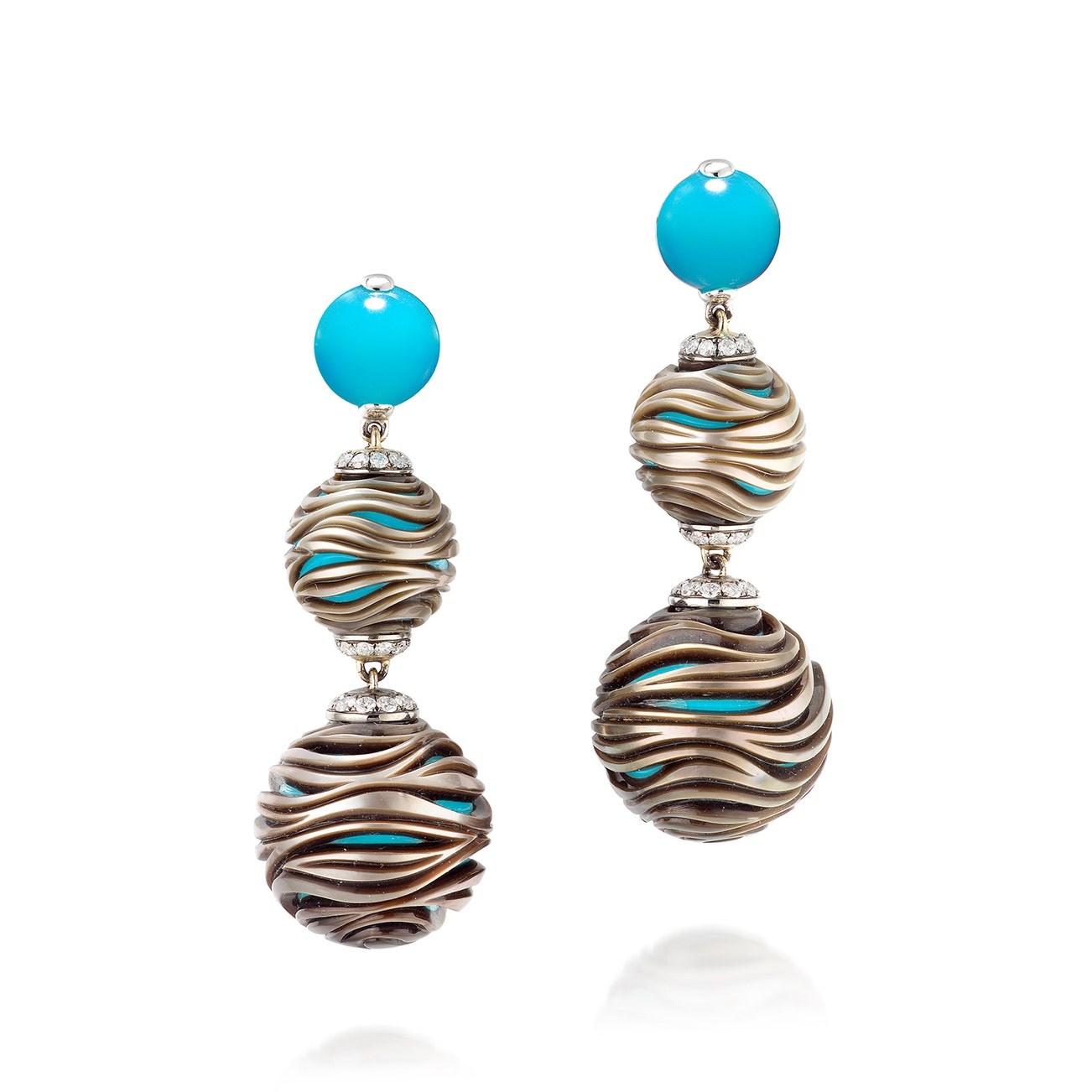 Each suspending two carved cultured pearls with synthetic turquoise nuclei, to a cabochon blue chalcedony top, decorated with brilliant-cut diamonds, mounted in white gold, post and butterfly fittings, length approximately 42 mm.