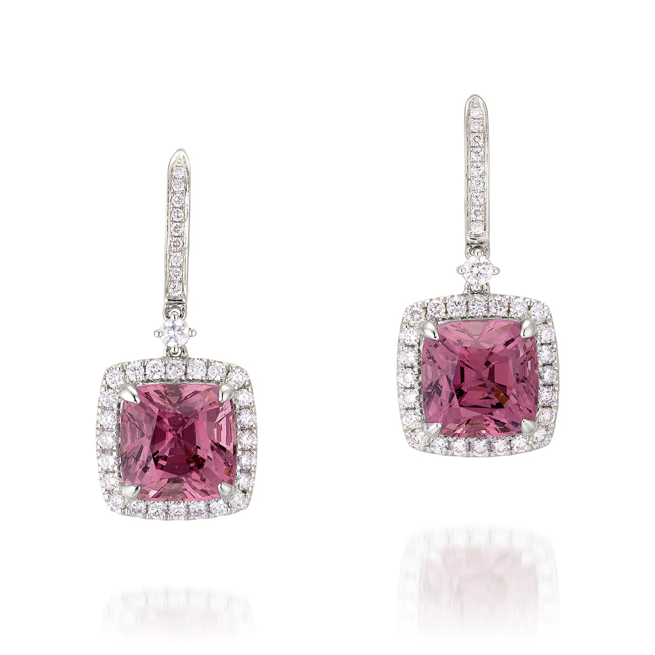 Each suspending a cushion-shaped spinel weighing approximately 10.24 carats in total, to the brilliant-cut diamond surround and surmount, mounted in white gold, hook and hinged back fittings, length approximately 29 mm.