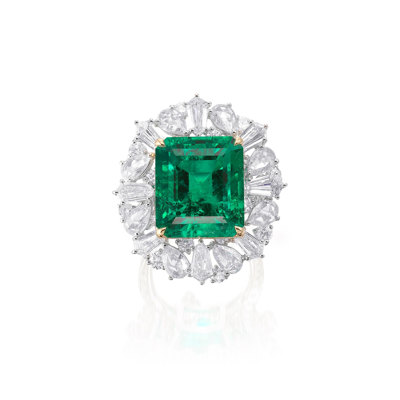 Set with a step-cut emerald weighing 14.19 carats, within a surround of rose-cut, shield-shaped and brilliant-cut diamonds, to the brilliant-cut diamond shoulders, mounted in white and yellow gold, size 6¼.