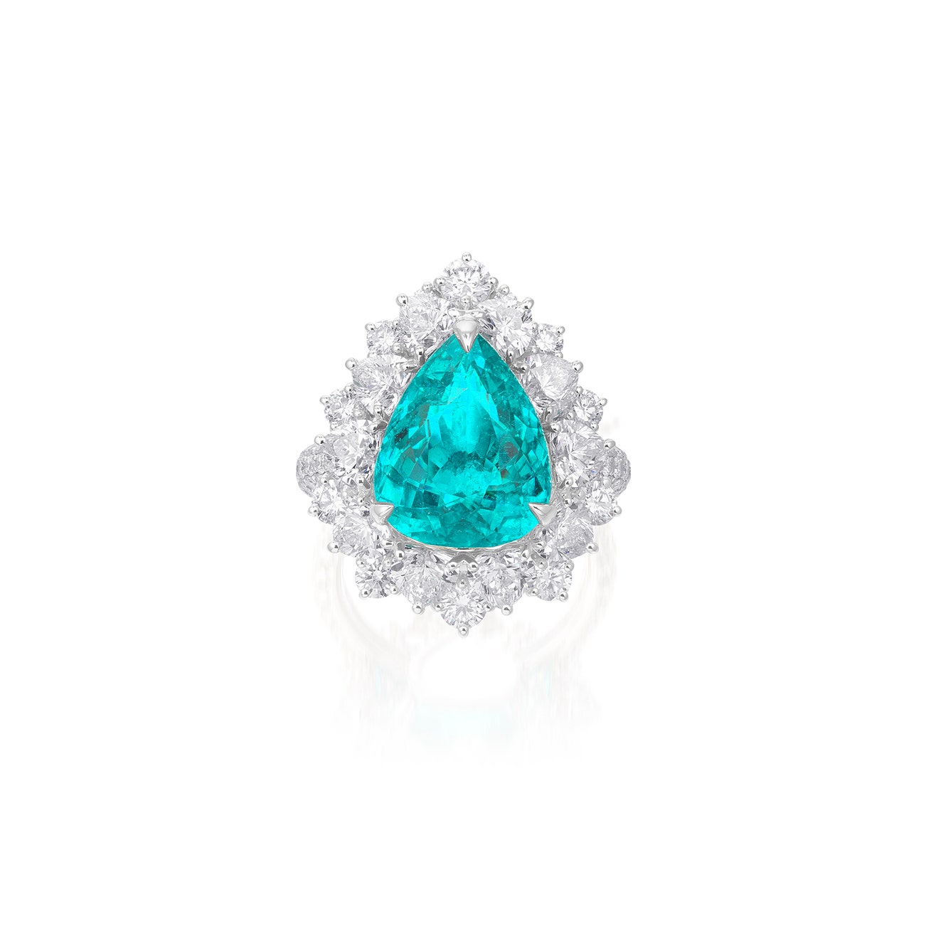 Set with a pear-shaped Paraíba tourmaline weighing 7.04 carats, surrounded by heart-shaped and brilliant-cut diamonds, to the pavé-set brilliant-cut diamond shoulders, mounted in white gold, size 6.