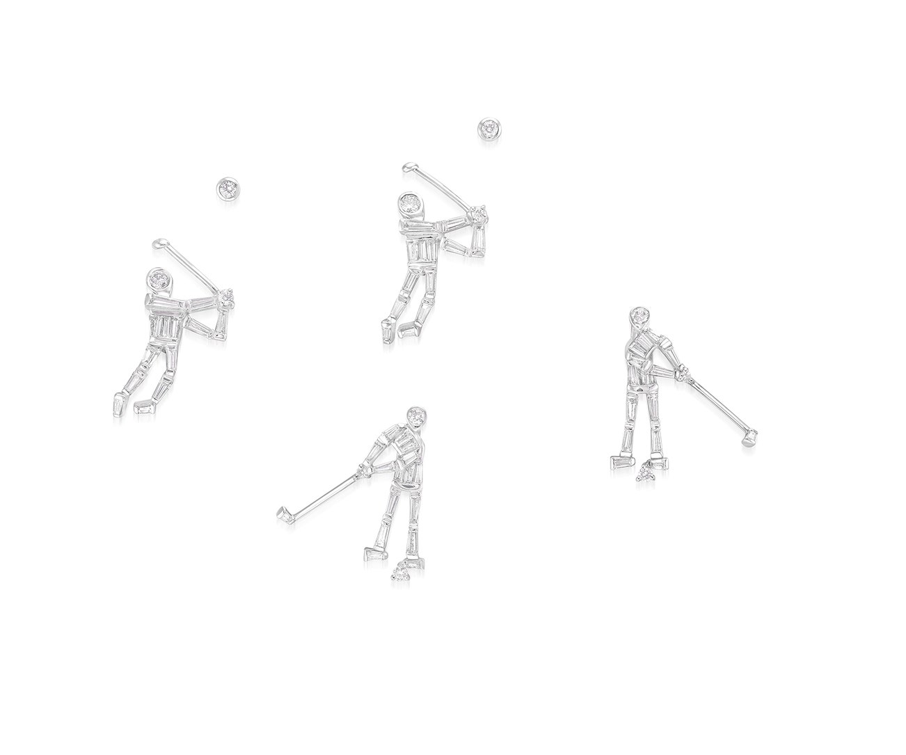 Four brooches each designed as a golfer, set with brilliant-cut and tapered baguette diamonds, all mounted in platinum, length approximately 29 to 26 mm.
