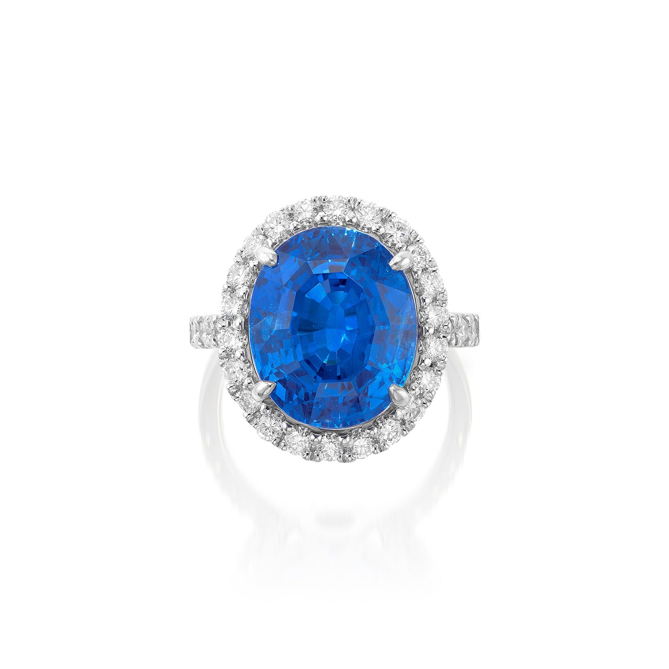 Set with an oval sapphire weighing 15.07 carats, to the brilliant-cut diamond surround, gallery and shoulders, mounted in platinum, size 7.