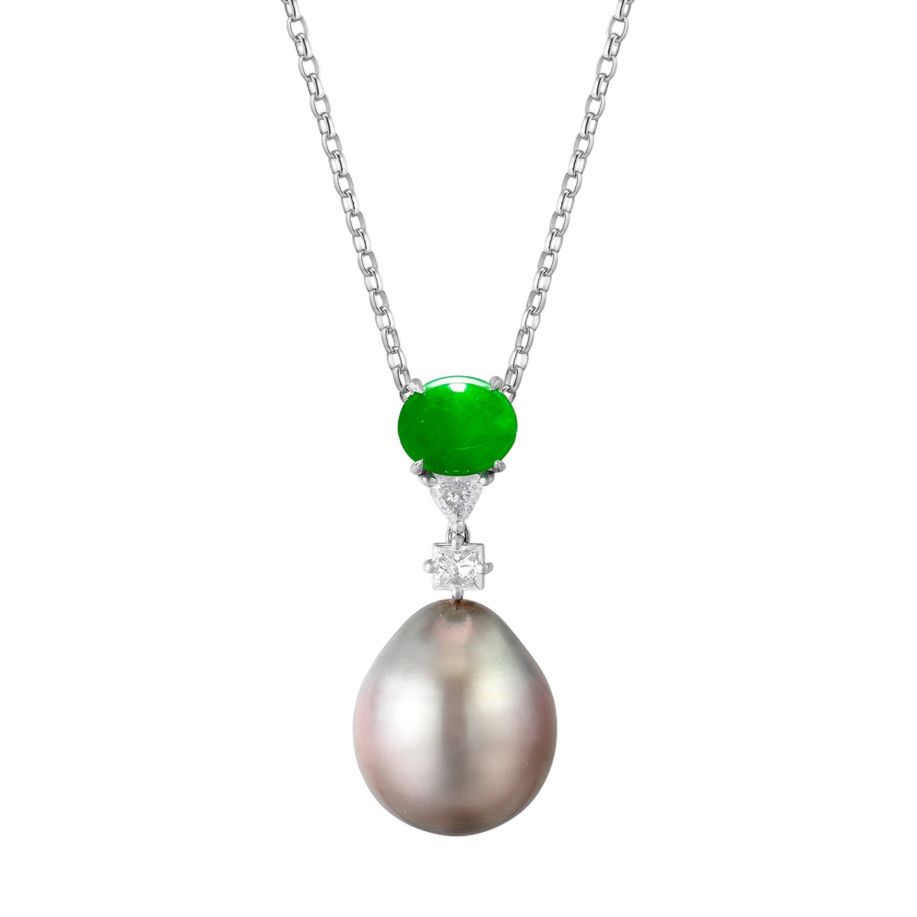 Set with a black cultured pearl measuring approximately 14.00 x 16.00 mm, suspended from a jadeite cabochon, spaced by square-cut and triangular-shaped diamonds, to a link chain, mounted in platinum, pendant length approximately 30 mm, link chain length approximately 400 mm.