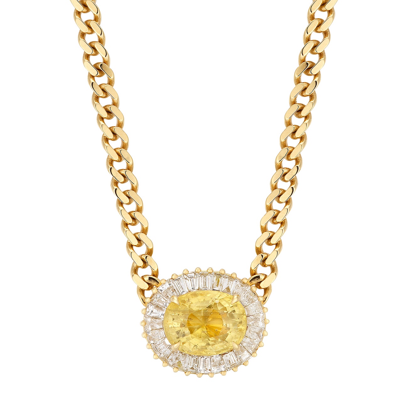 Set with an oval yellow sapphire weighing approximately 5.10 carats, to a tapered baguette diamond surround and link chain, mounted in yellow gold, link chain maximum length approximately 445 mm.