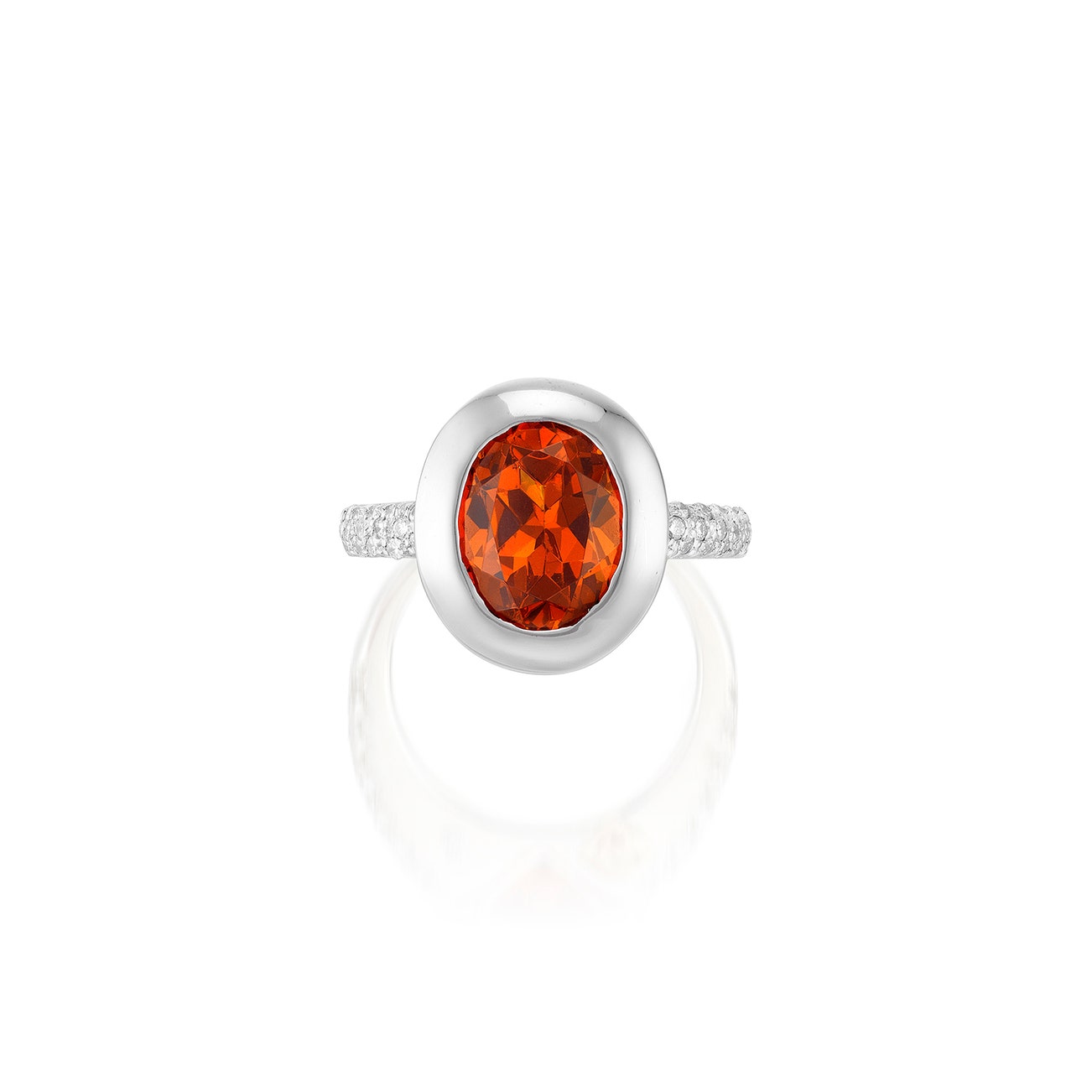 Set with an oval spessartine garnet, to the brilliant-cut diamond shoulders, mounted in white and pink gold, size 6¼