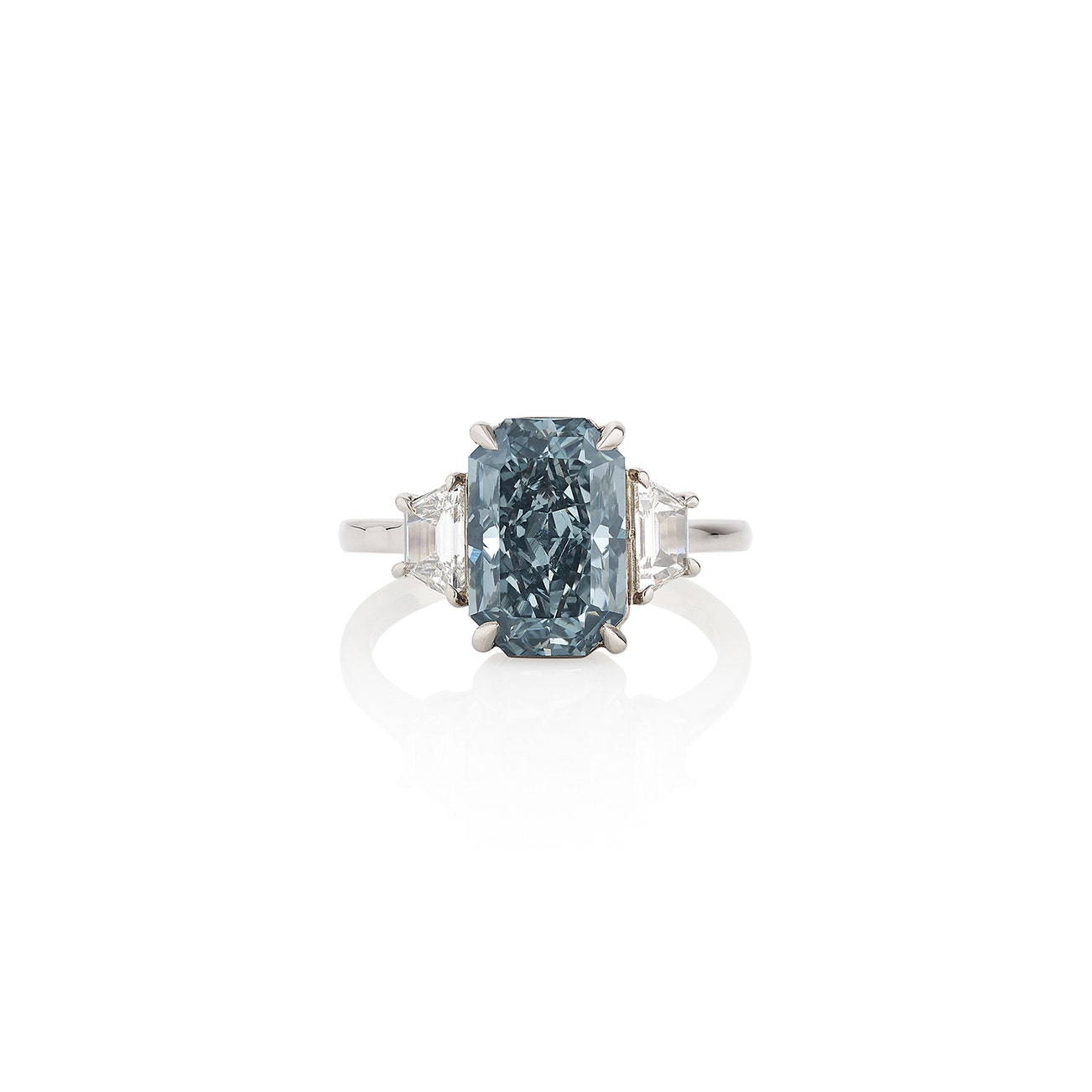 Set with a cut-cornered rectangular-cut fancy dark grey-blue diamond weighing 3.88 carats, between trapeze-shaped diamond shoulders, size 52.