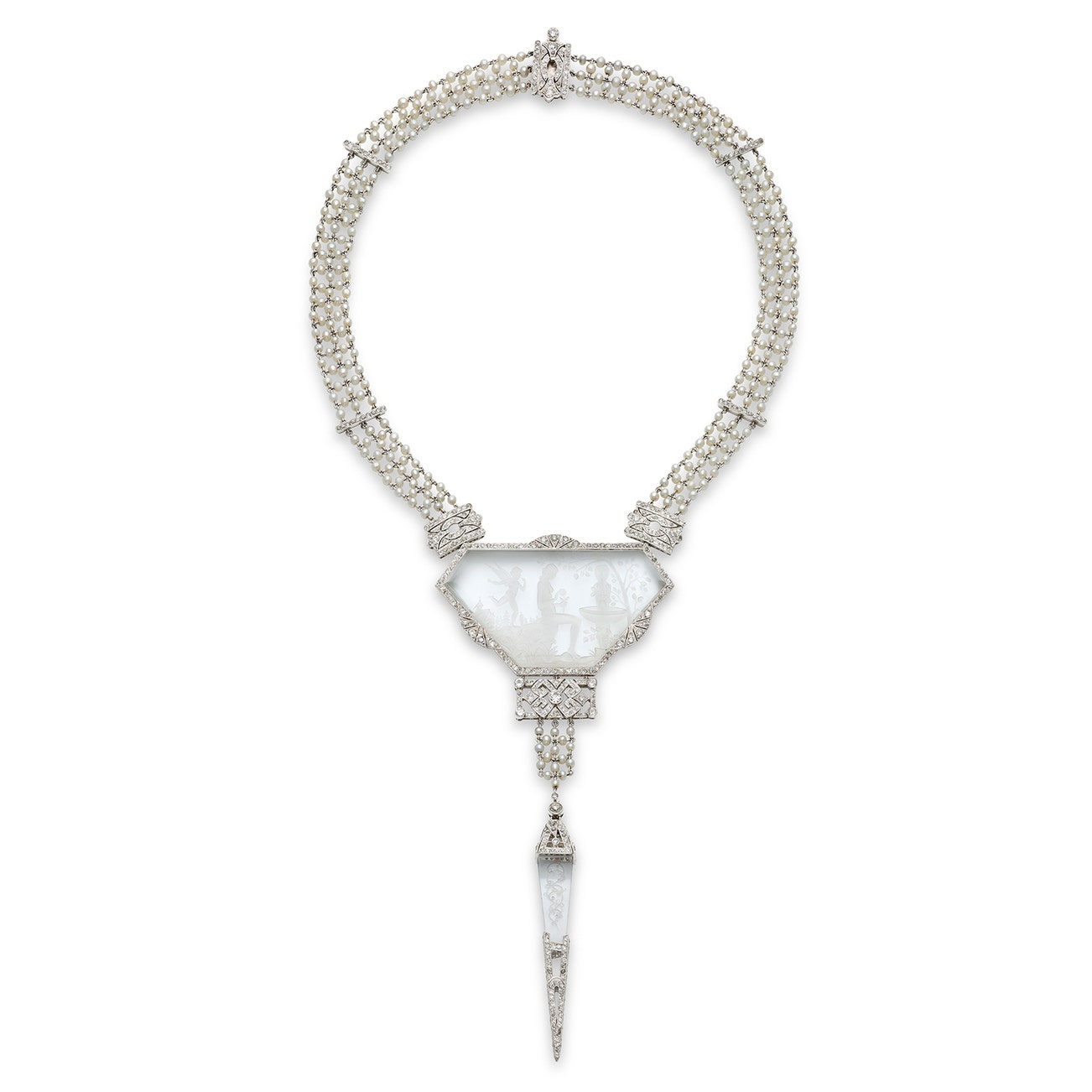 The seed pearl necklace supporting a rock crystal plaque engraved with a classical scene, framed with millegrain-set circular-cut diamonds, suspending a pyramidal rock crystal pendant embellished with engraved scroll motifs, highlighted with millegrain-set circular-cut diamonds, length approximately 435mm.
