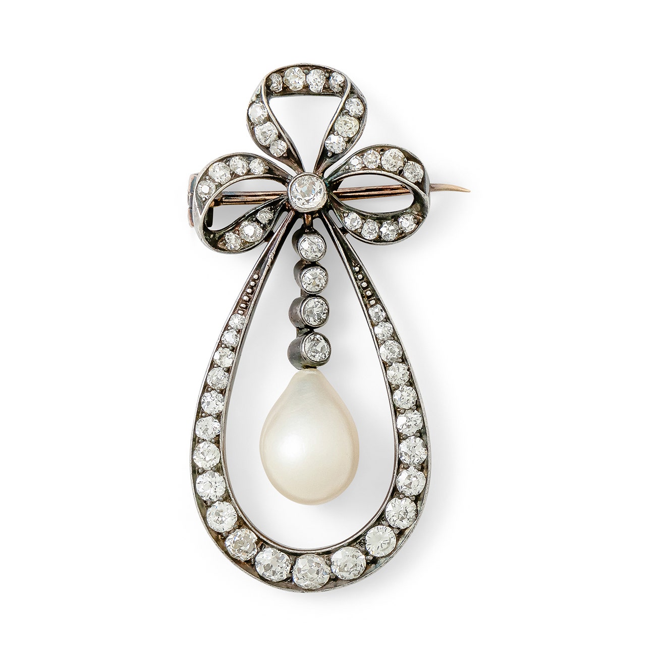 Of bow design, set with a drop-shaped natural pearl measuring approximately 10.3 x 7.41 x 7.19mm, accented with circular-cut diamonds, measuring approximately 40 x 17mm.