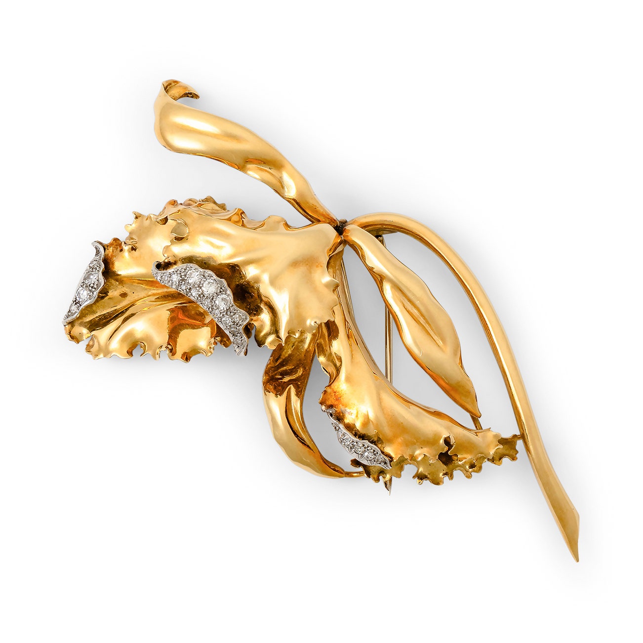 Of floral design, the petals embellished with brilliant- and single-cut diamonds, measuring approximately 110 x 45mm, Italian maker's mark and assay mark for gold.