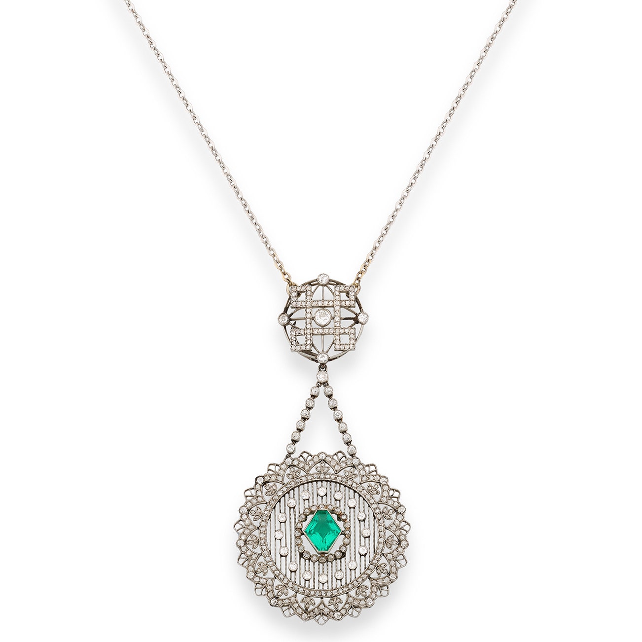 The lattice pattern set with a hexagonal step-cut emerald, accented with millegrain-set circular-, single- and rose-cut diamonds, measuring approximately 80 x 40mm, suspended from a chain, length approximately 440mm, Italian maker's mark.