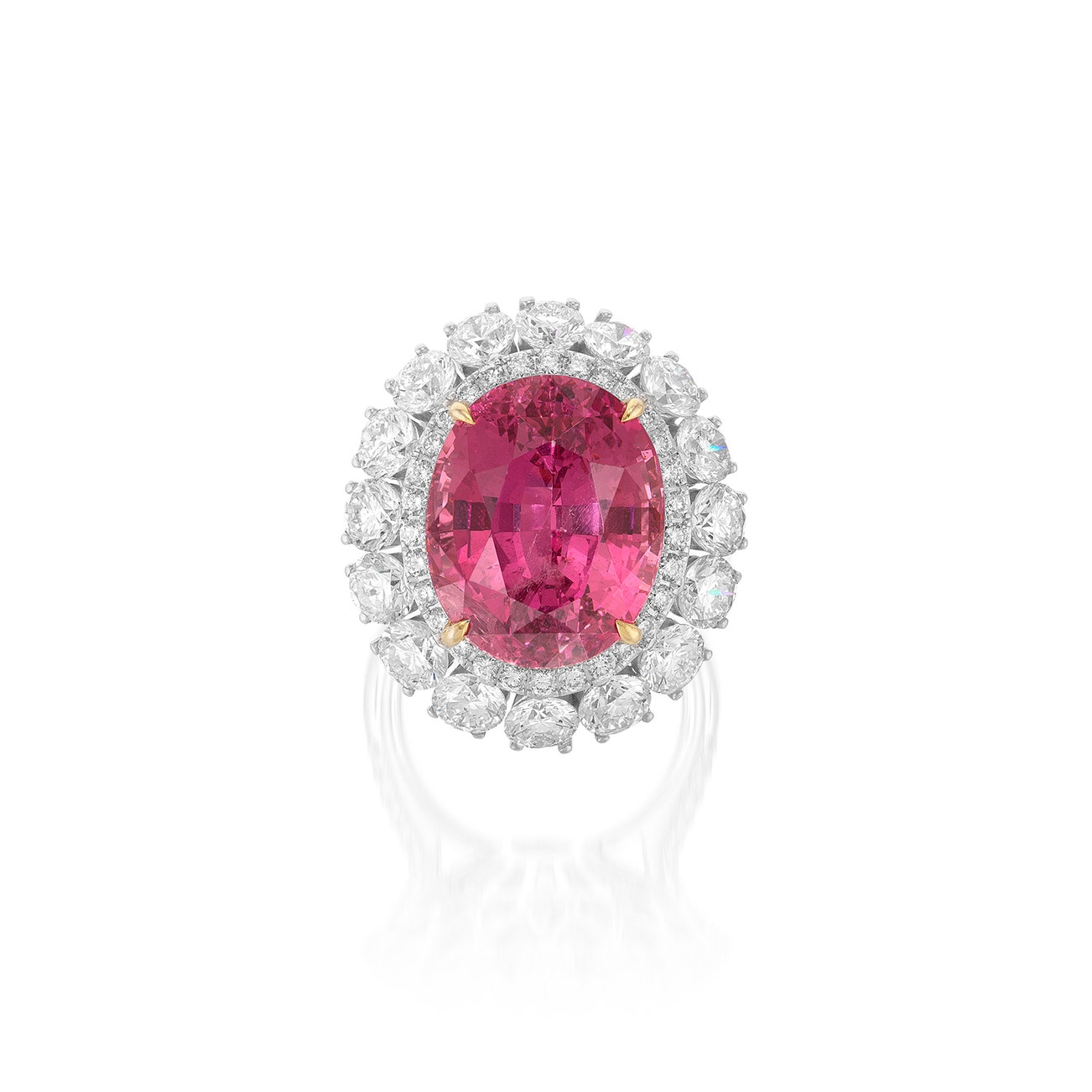 Set with an oval pink spinel weighing 18.02 carats, to the brilliant-cut diamond surrounds and shoulders, size 6¼.
