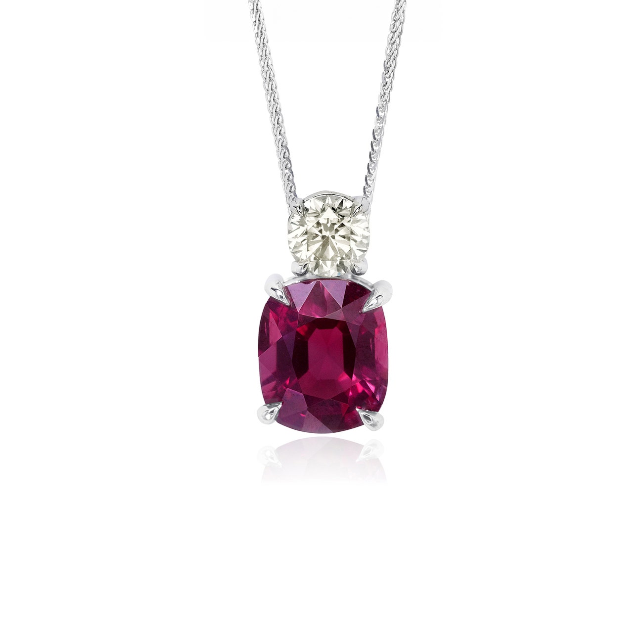 Set with a cushion-shaped red-purple spinel weighing 5.14 carats, accented by a brilliant-cut fancy brown-greenish yellow diamond weighing 1.00 carat, mounted in platinum, suspended from an 18k white gold chain, chain length approximately 17 inches.