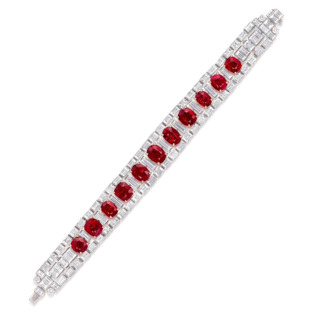 Set with eleven graduated oval and cushion-shaped rubies weighing approximately 22.21 carats in total, within borders set with baguette diamonds, highlighted with brilliant-cut diamonds, length approximately 166 mm.