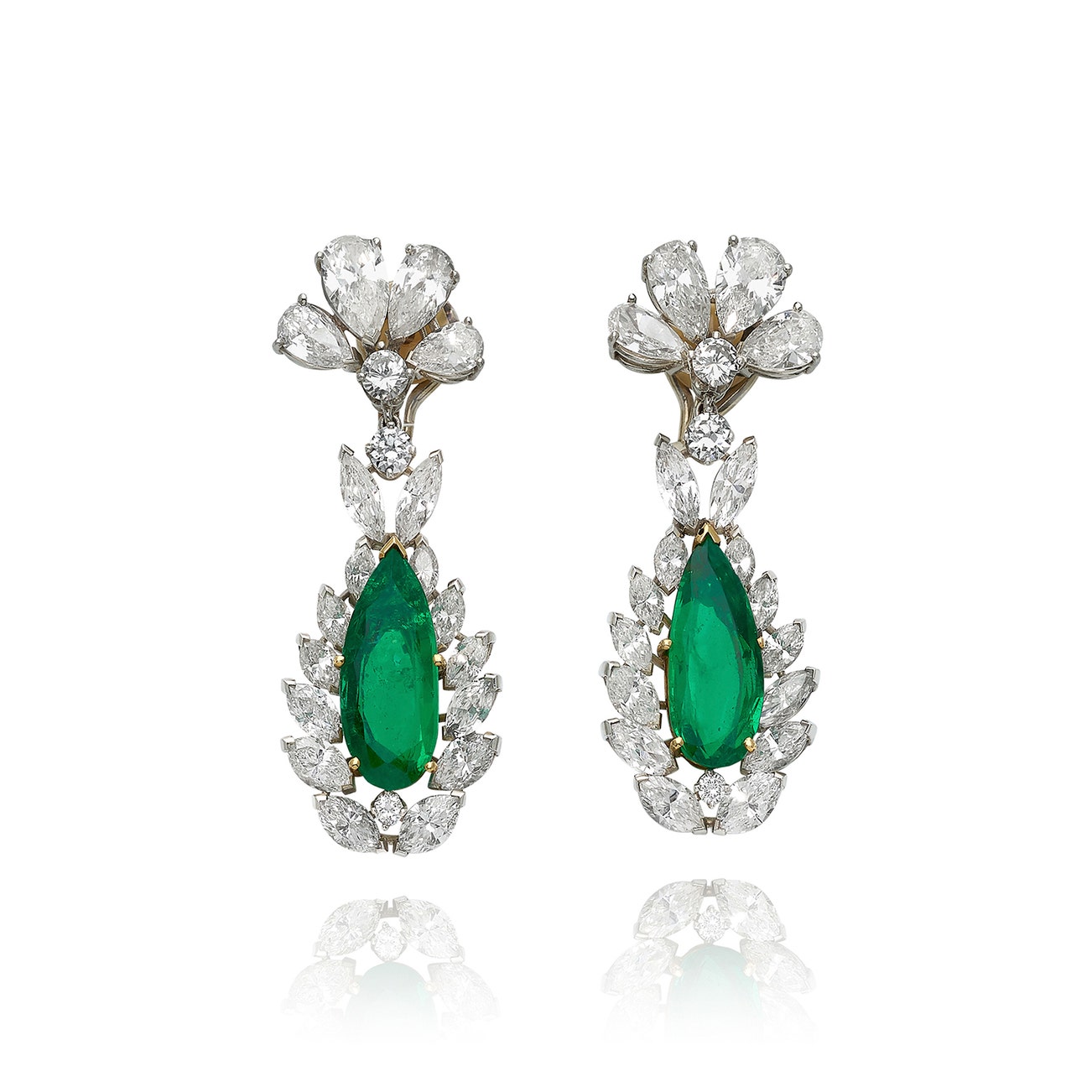 Each set with a pear-shaped emerald weighing 4.57 and 4.10 carats respectively, within a frame of marquise-shaped diamonds, the surmount set with pear-shaped and brilliant-cut diamonds, length approximately 45mm.