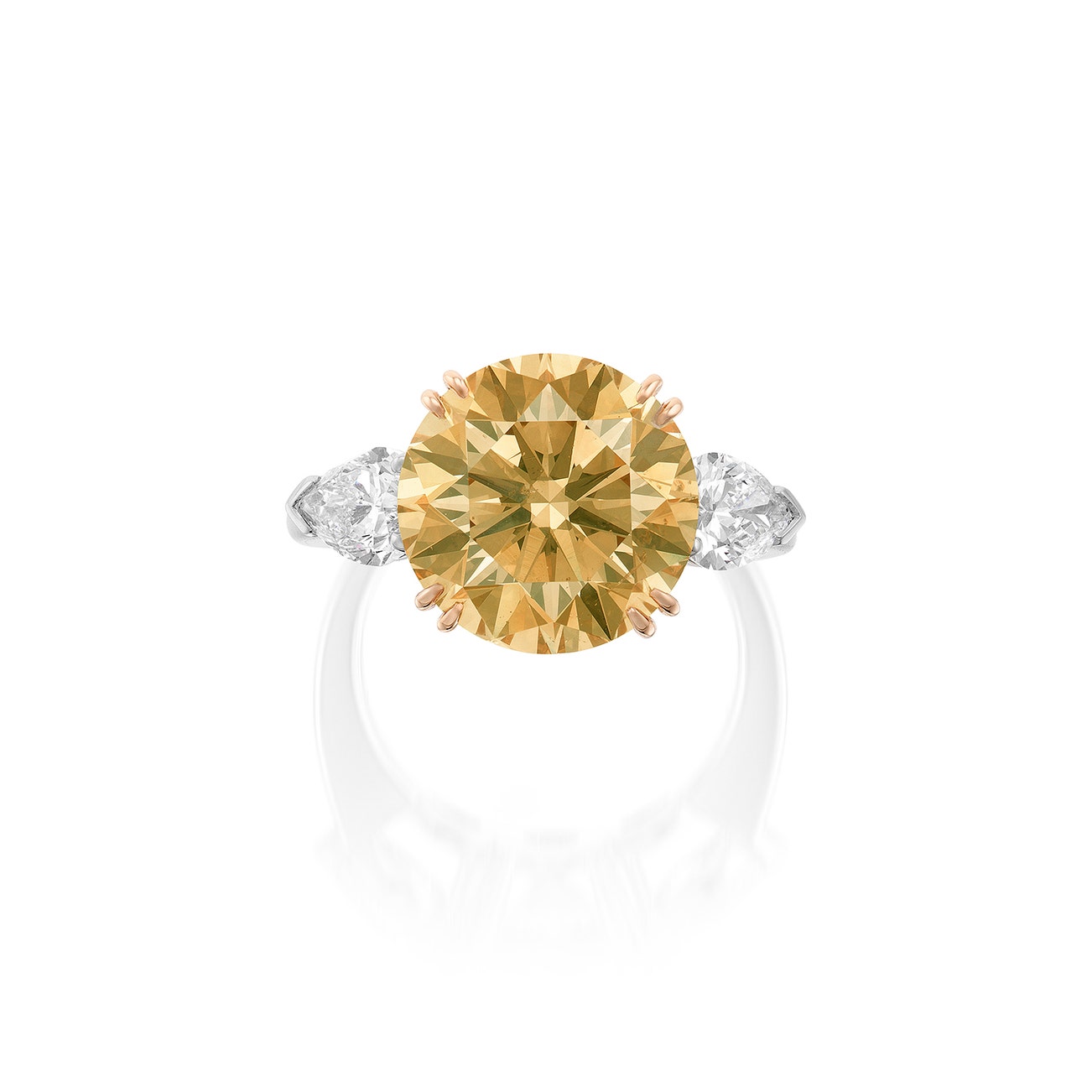 Set with a brilliant-cut fancy brown-yellow diamond weighing 7.12 carats, flanked by two pear-shaped diamonds, mounted in platinum and pink gold, size 6.