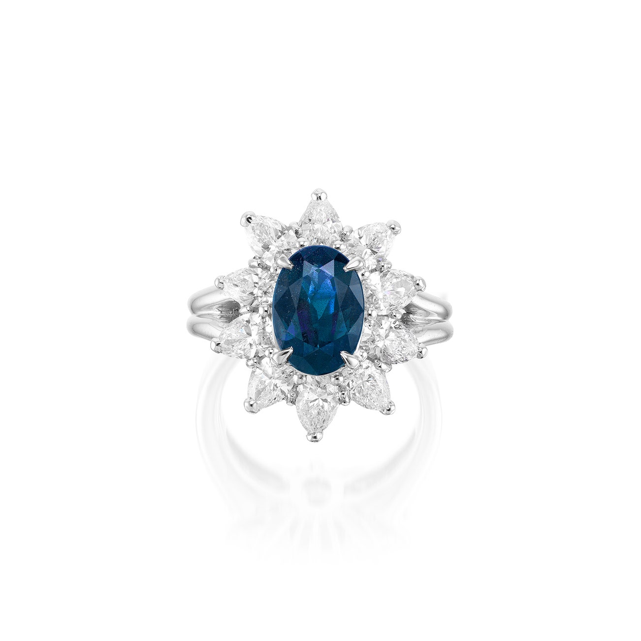 Set with an oval alexandrite chrysoberyl weighing approximately 2.53 carats, to the pear-shaped diamond surround, mounted in platinum, size 6.
