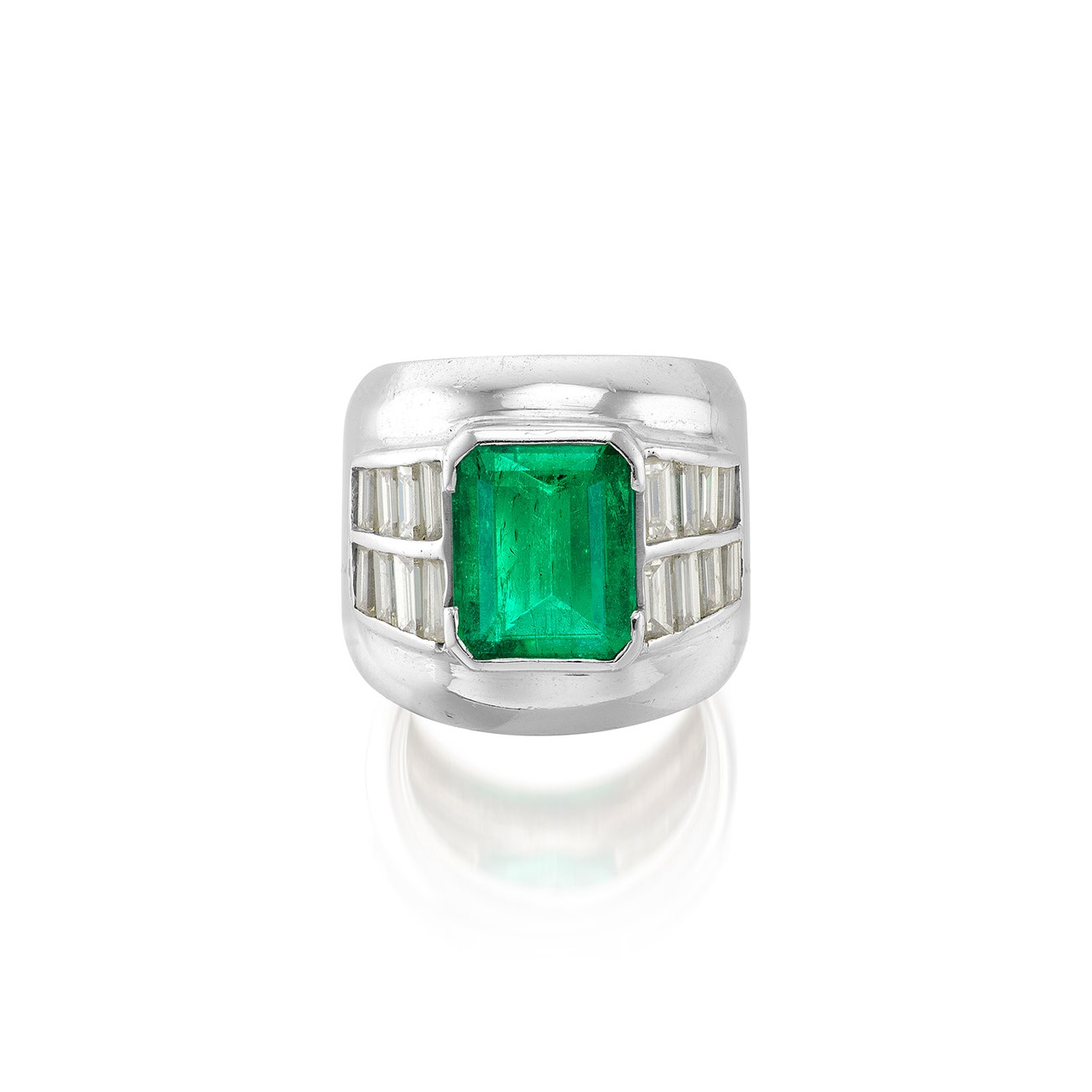 Set with a step-cut emerald weighing approximately 3.80 carats, between tapered baguette and baguette diamonds, mounted in white gold, size 5½.