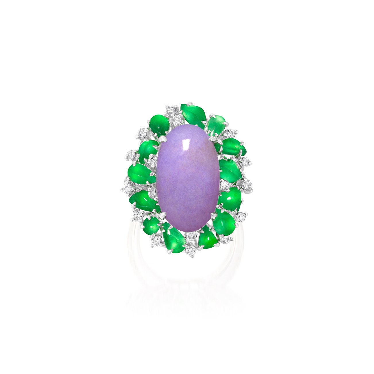 Set with an oval lavender jadeite cabochon measuring approximately 16.83 x 9.98 x 5.21 mm, surrounded by variously-shaped bright green jadeite cabochons and brilliant-cut diamonds, to the pavé-set diamond shoulders, mounted in white gold, size 5¼.