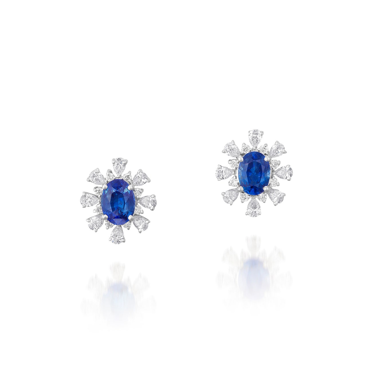 Each set with an oval sapphire weighing approximately 2.95 carats in total, within surrounds of pear-shaped and brilliant-cut diamonds, post and butterfly fittings, length approximately 15 mm.