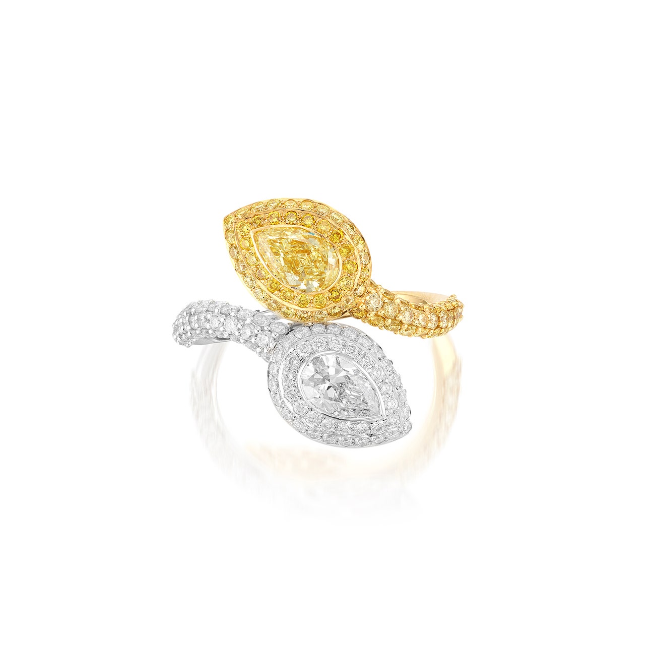 Of toi e moi design, set with a pear-shaped fancy yellow diamond weighing 0.60 carat and a pear-shaped diamond, each to the double surround and shoulders of brilliant-cut diamonds of yellow tint or diamonds, mounted in yellow and white gold, size 7¼.