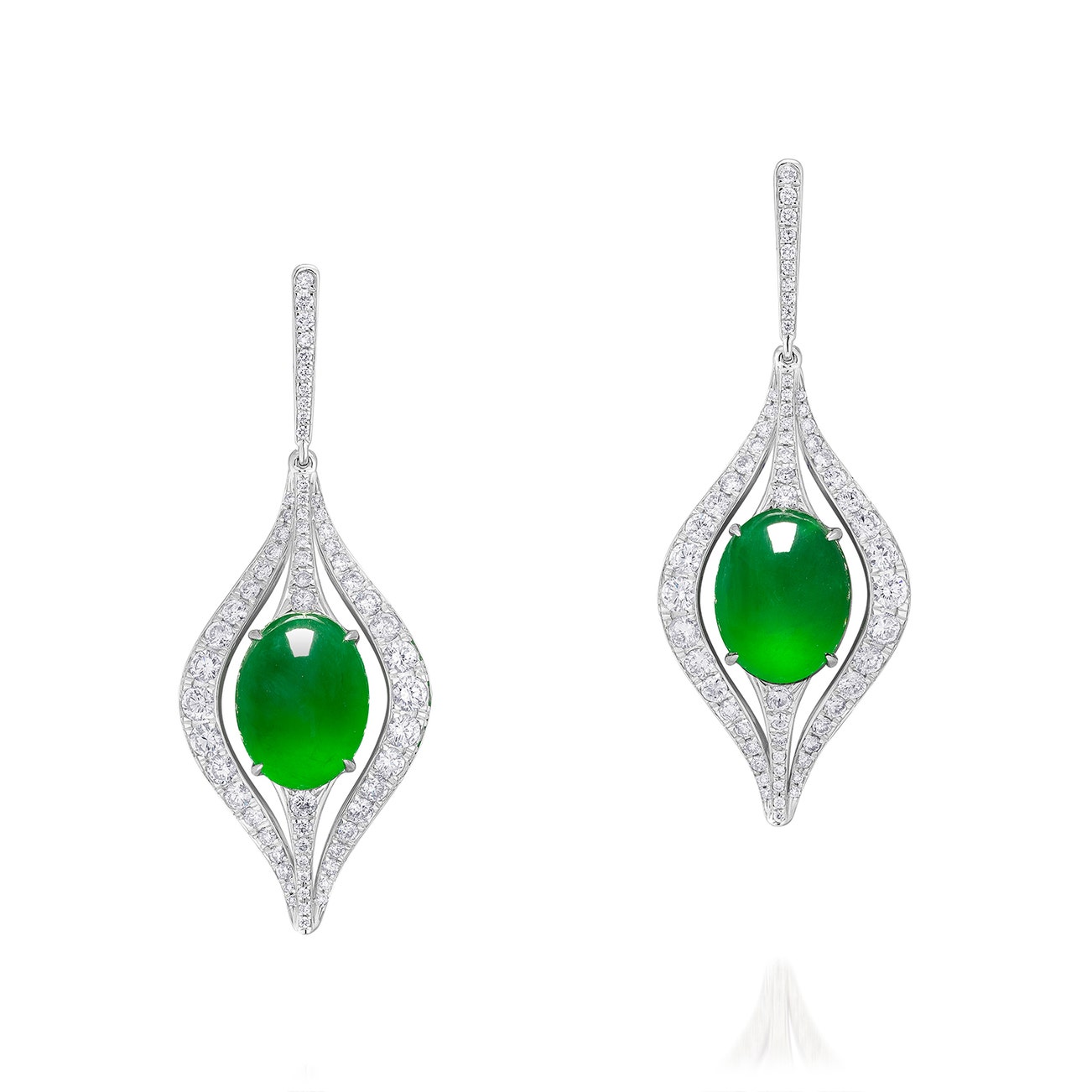 Each set with an oval jadeite cabochon of bright green colour and very good translucency, measuring approximately 12.11 x 9.00 x 5.35 and 11.96 x 9.28 x 5.15 mm respectively, surrounded by brilliant-cut diamonds, mounted in white gold, post and butterfly fittings, length approximately 45 mm.