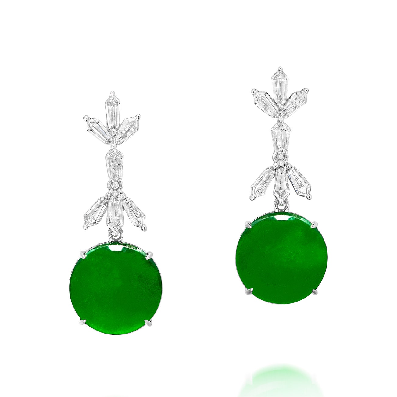 Each set with a round jadeite cabochon, measuring approximately 12.07-12.16 x 2.89 and 11.96-12.08 x 2.73 mm, of brilliant green colour and very good translucency, to the brilliant-cut diamond trim, suspended from modified kite-shaped diamond surmount, mounted in white gold, post and butterfly fittings, length approximately 30 mm.