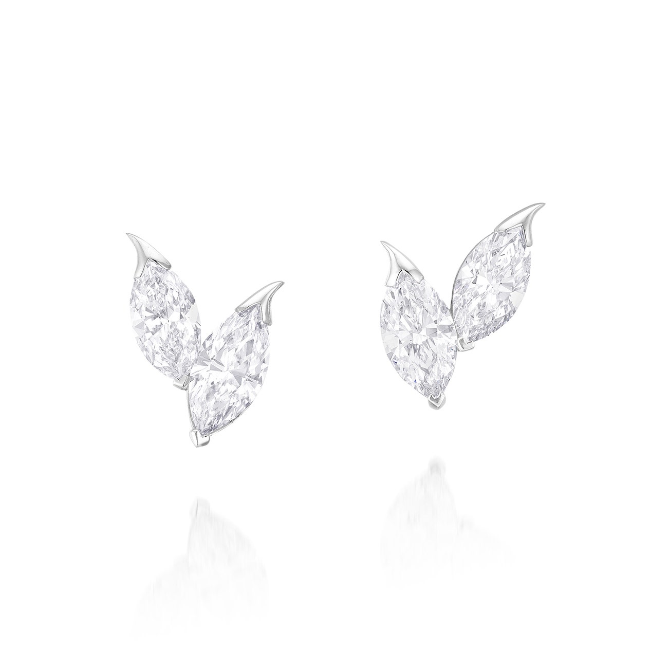 Set with four marquise-shaped diamonds weighing 5.88 carats in total, mounted in white gold, post and butterfly fittings, length approximately 18 mm.