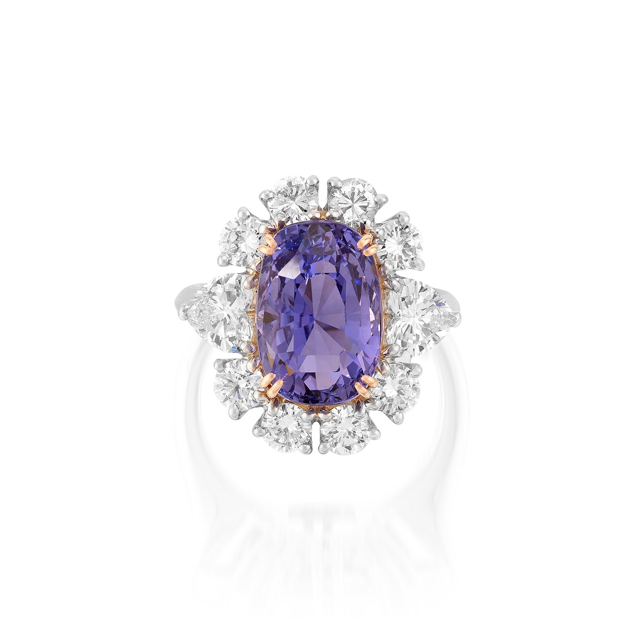 Set with an oval colour-change sapphire weighing approximately 11.33 carats, within a surround of brilliant-cut and heart-shaped diamonds, mounted in platinum and pink gold, size 6.