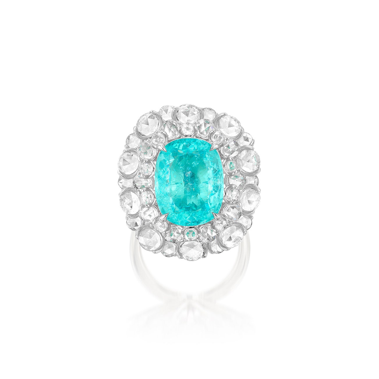 Set with a cushion-shaped Paraíba-type tourmaline weighing 6.89 carats, within surrounds of rose-cut diamonds, mounted in white gold, size 6½.