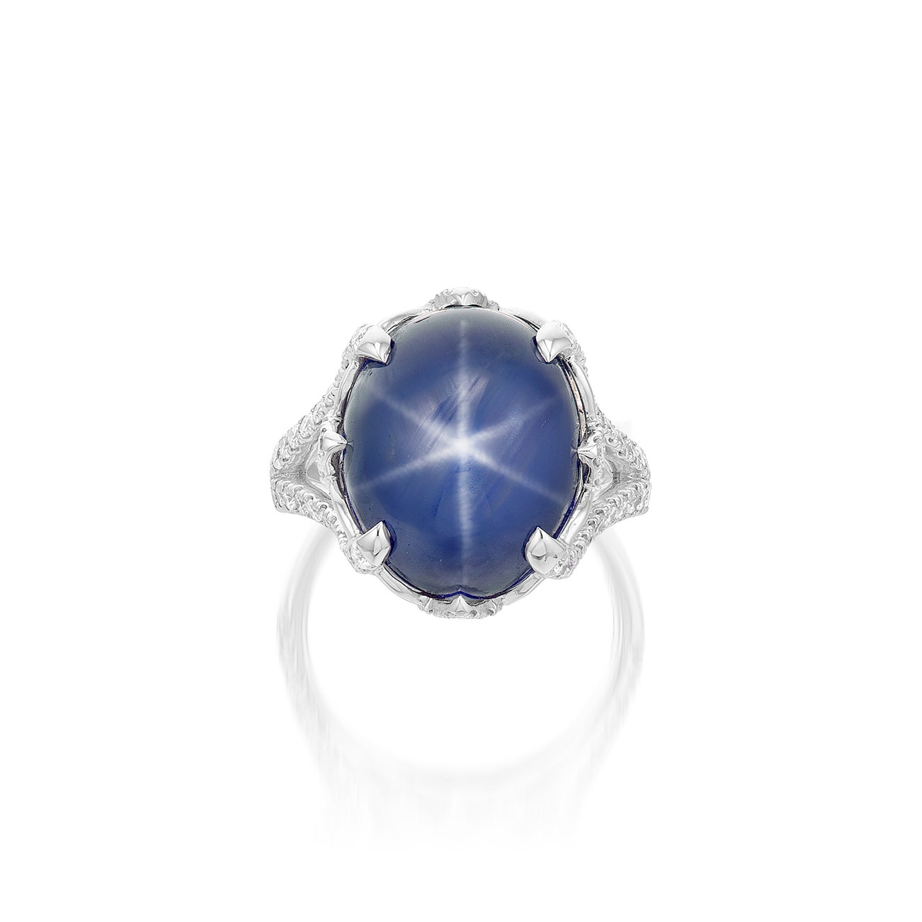 Set with an oval cabochon star sapphire weighing 21.13 carats, to the prong, gallery and shoulders decorated with brilliant-cut diamonds, mounted in white gold, size 6.