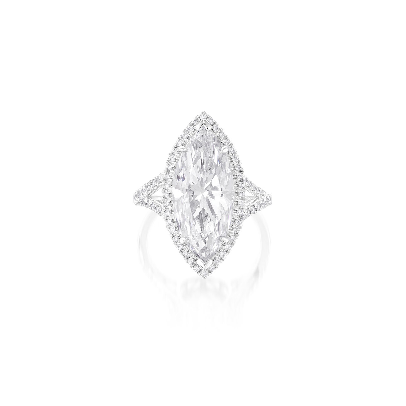 Set with a marquise-shaped diamond weighing 6.30 carats, to the brilliant-cut diamond surround and bifurcated shoulders, mounted in white gold, size 6.