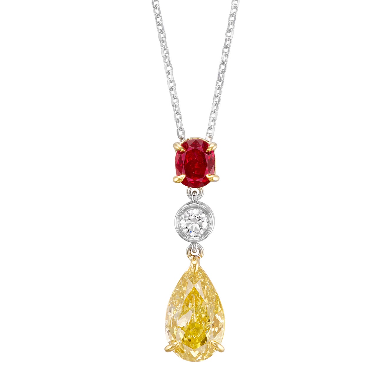 Suspending a pear-shaped fancy brownish greenish yellow diamond weighing 2.01 carats and an oval ruby weighing 0.71 carat, spaced by a collet-set brilliant-cut diamond, to a fine link chain, mounted in yellow and white gold, pendant length approximately 25 mm, link chain length approximately 405 mm.