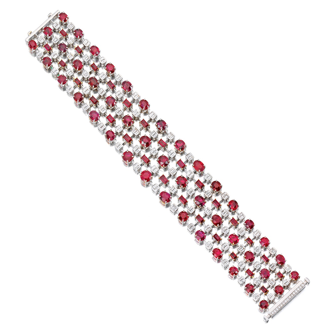 Set with oval- and rectangular-cut rubies, complimented by baguette and brilliant-cut diamonds, mounted in 18k white gold, length approximately 6 3/4 inches.