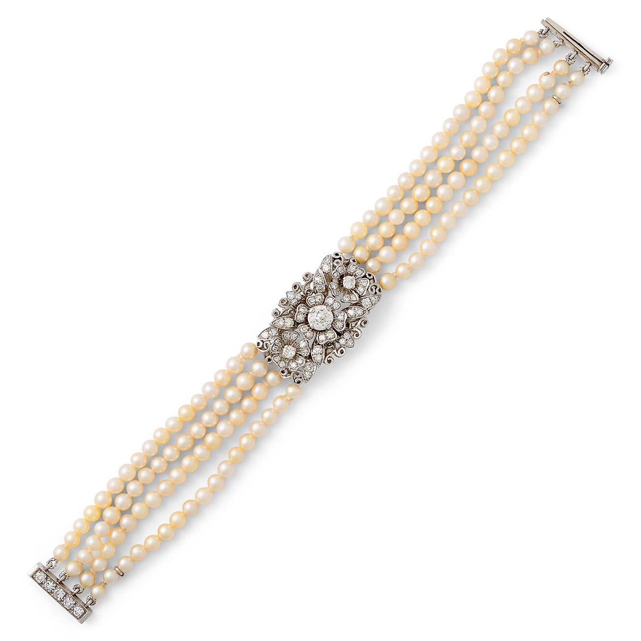 Composed of four strands of cultured pearls measuring from approximately 3.67mm to 3.84mm, embellished with an openwork plaque decorated with floral motifs, set with single- and circular-cut diamonds, length approximately 70mm.