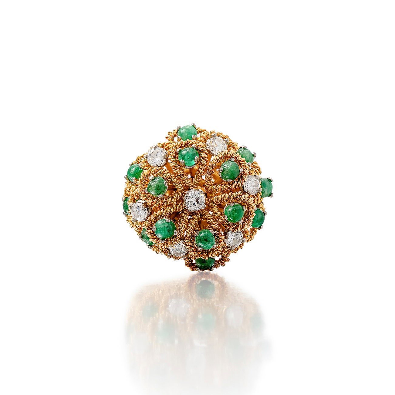 Set with cabochon emeralds and brilliant-cut diamonds, decorated throughout with gold corded wire,
