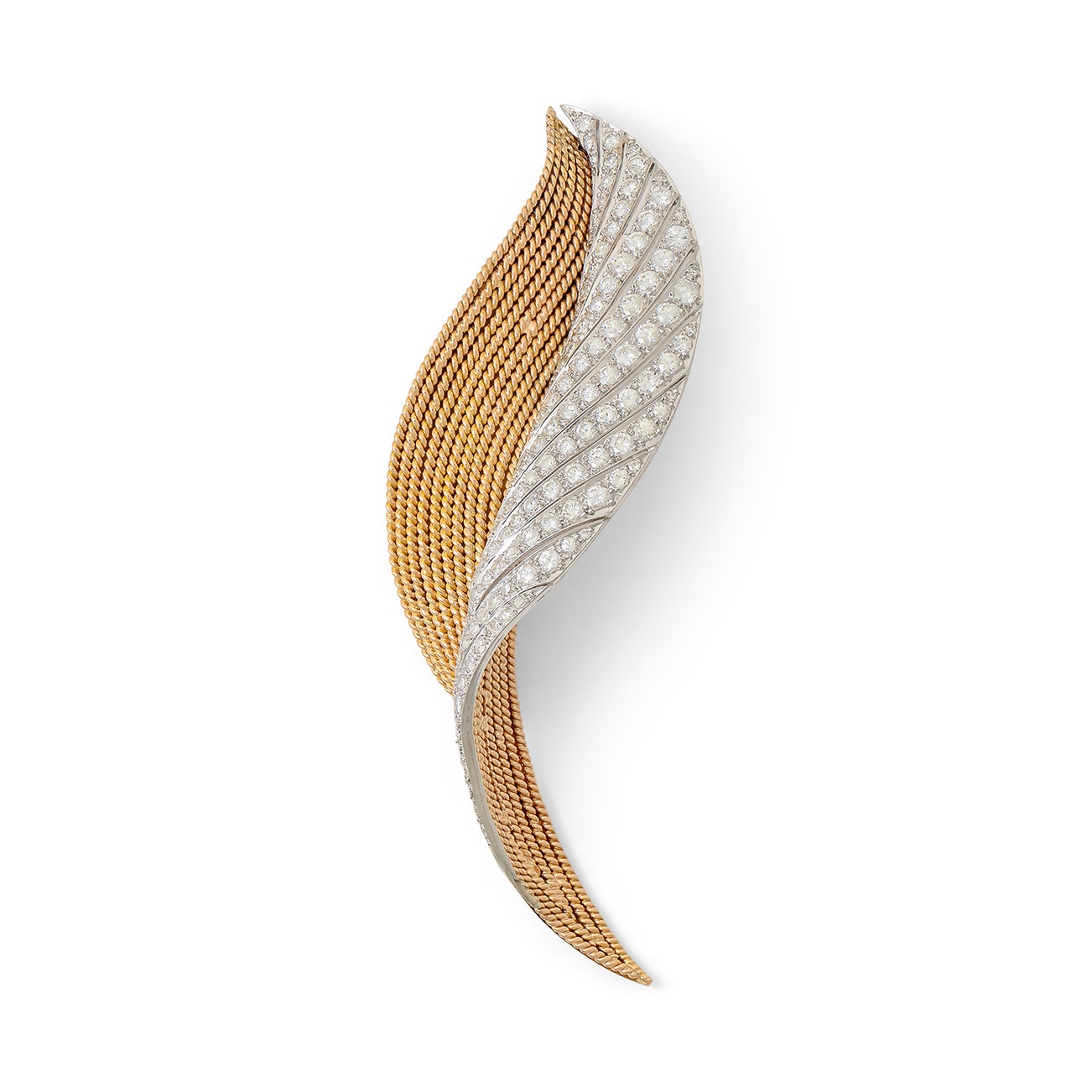 Of foliate design, set with graduated brilliant-cut diamonds, decorated with gold corded wire, measuring approximately 100 x 34mm.