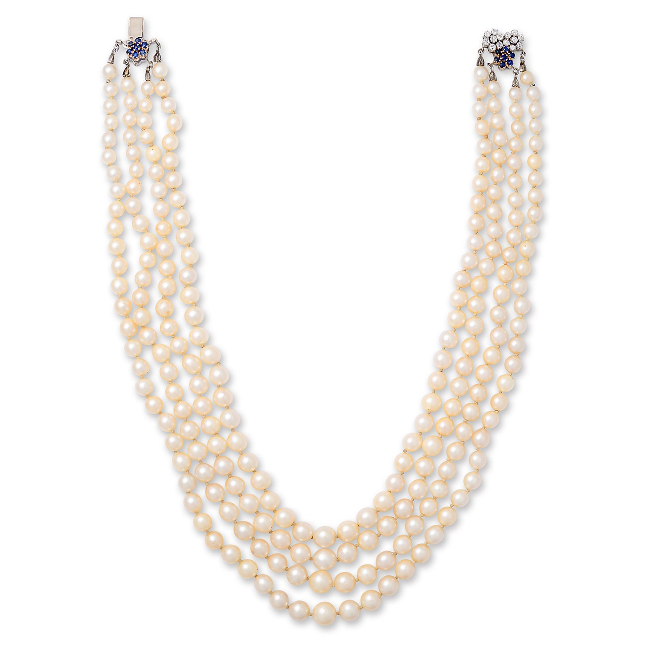 Composed of four strands of graduated cultured pearls measuring from approximately 6.02mm to 10.38mm, the clasp of floral motif set with circular-cut sapphires and diamonds, length approximately 495mm.