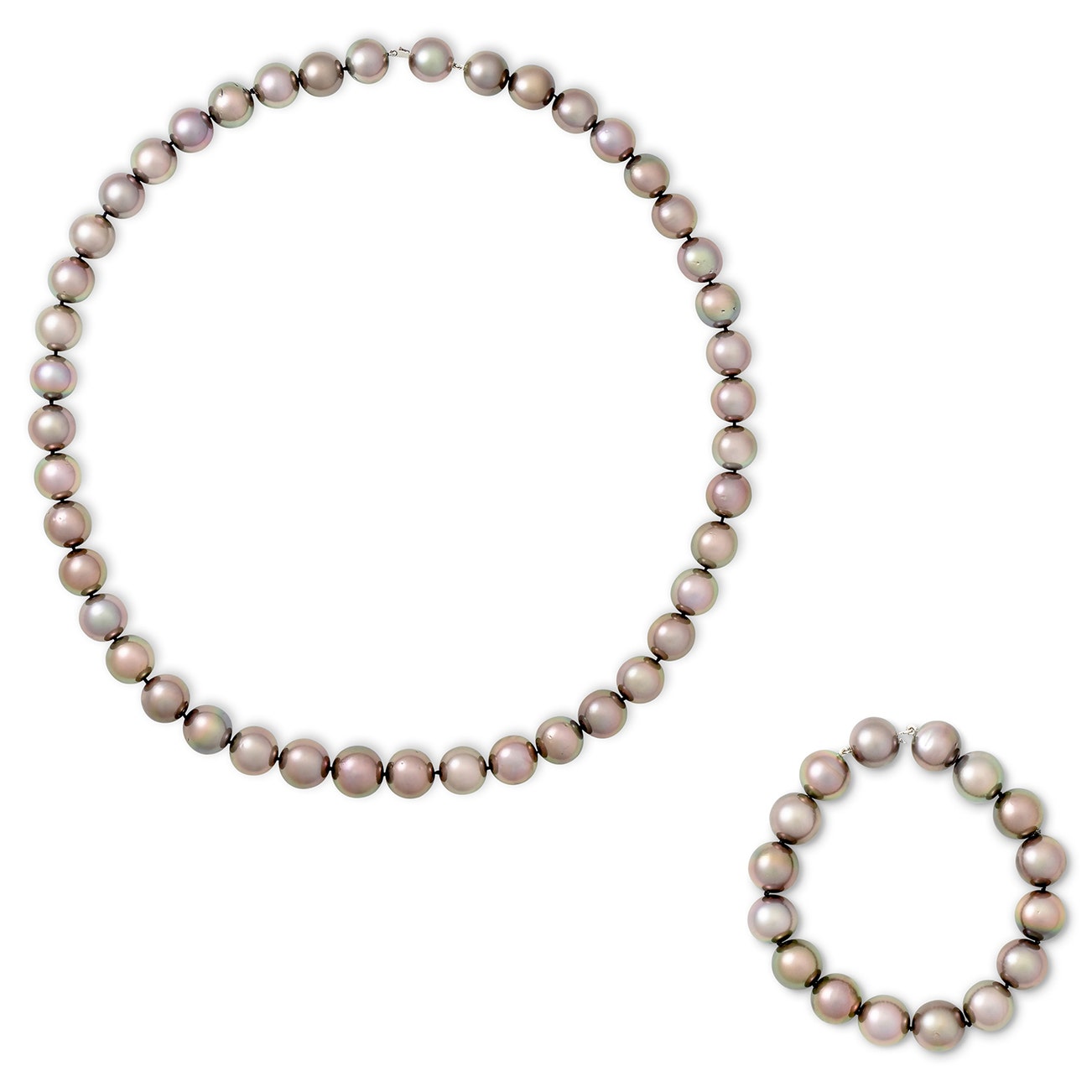 The necklace composed of forty-four Tahitian cultured pearls of natural colour, measuring from 11.8 - 14.6mm, length approximately 560mm,; the bracelet composed of sixteen Tahitian cultured pearls of natural colour, measuring from 11.57 - 11.68mm, length approximately 190mm, may be combined and worn as a sautoir. ¨