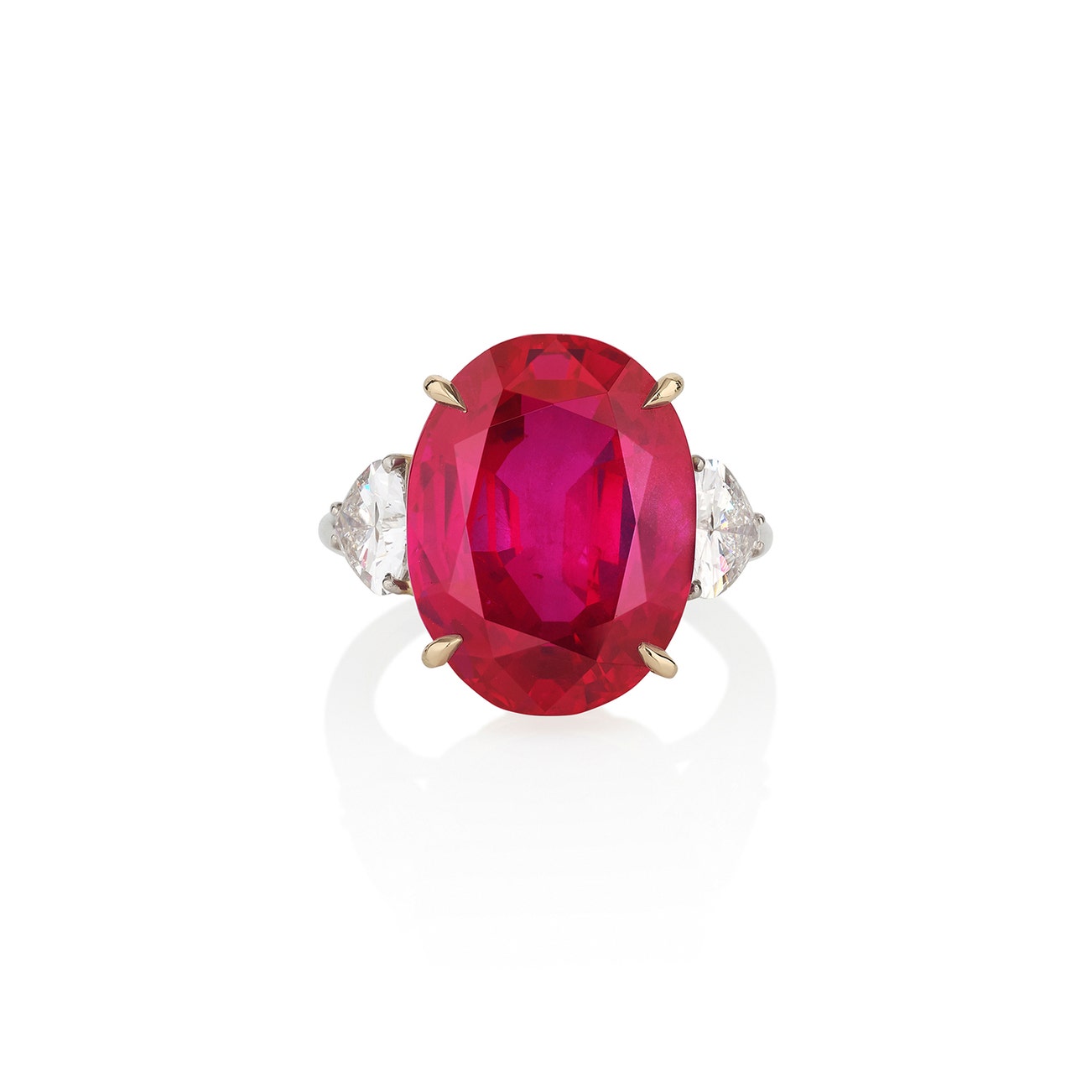 Set with an oval ruby weighing 17.97 carats, between pear-shaped diamonds, size 52.